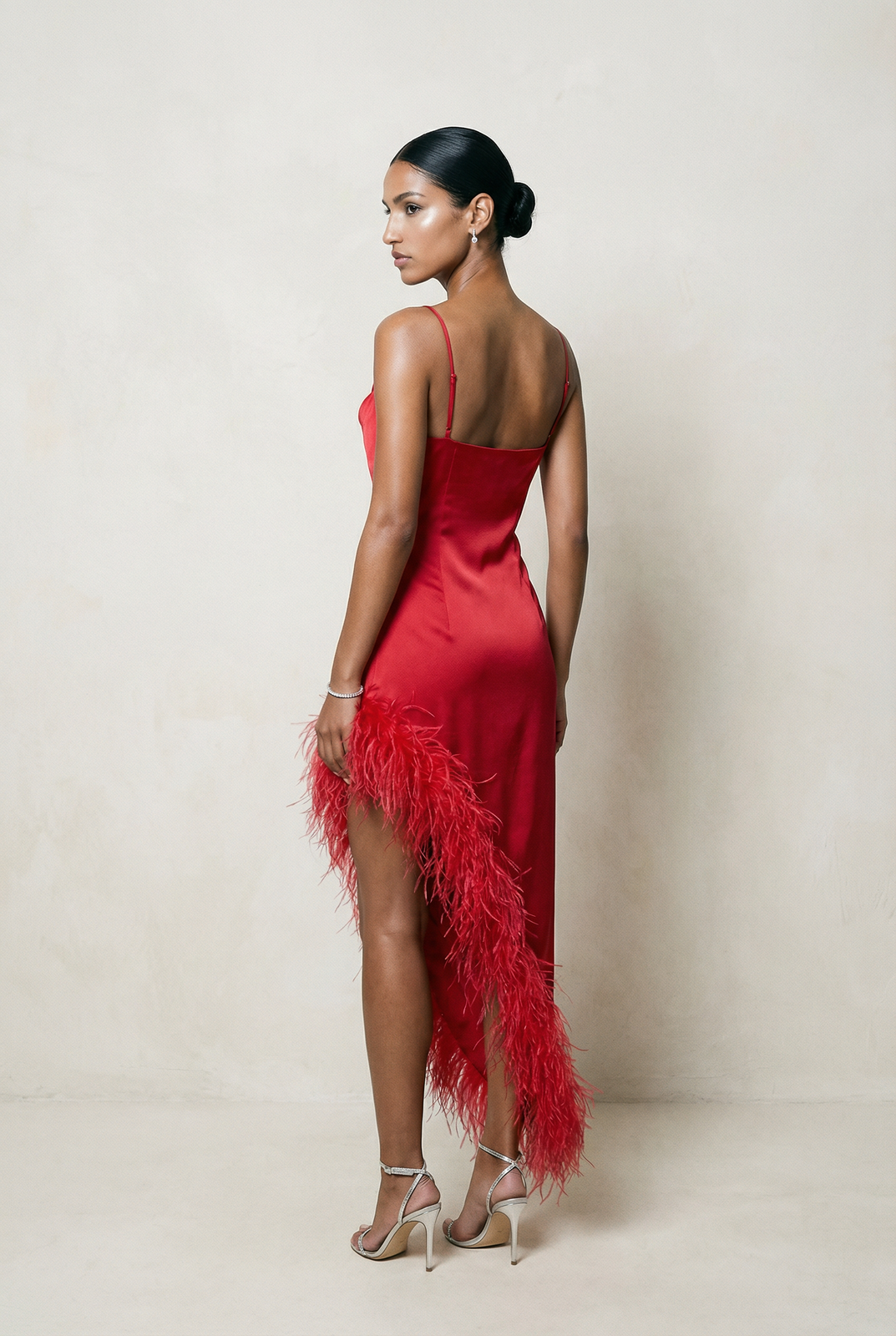 CZERWONA SUKIENKA Z PIÓRAMI JARDIN ROUGE