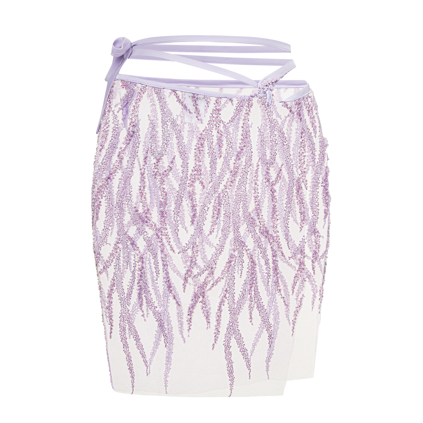 - Mini pareo wykonane z wykonanej dla Noemme ręcznie wyszywanej koralikami szyfonowej tkaniny w odcieniu fioletu. Wykończona elastycznymi sznureczkami, które możemy dowolnie wiązać wokół talii.